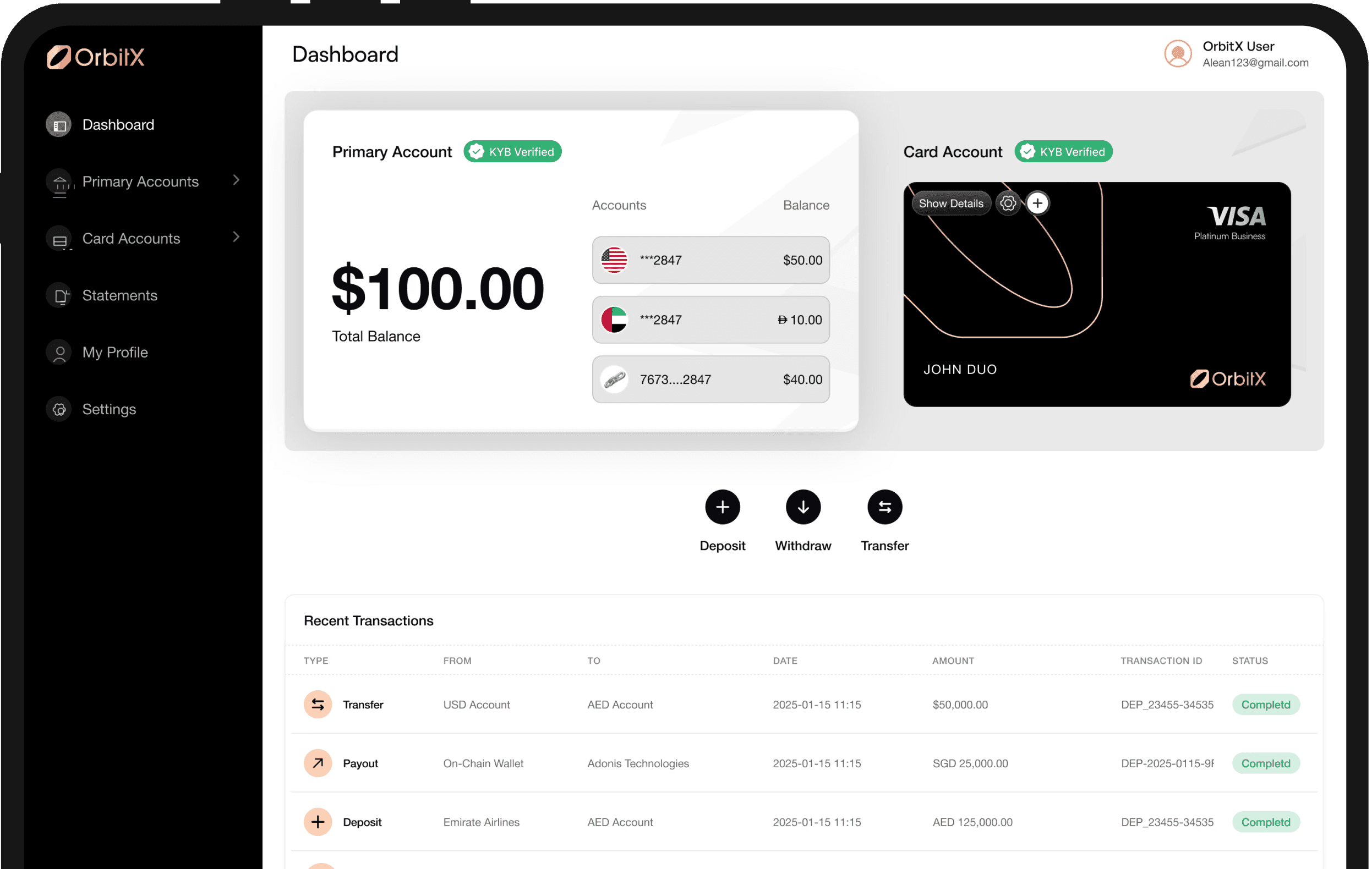 A single balance that works everywhere — cards, bank accounts, payouts, and on-chain settlement, all from one system.